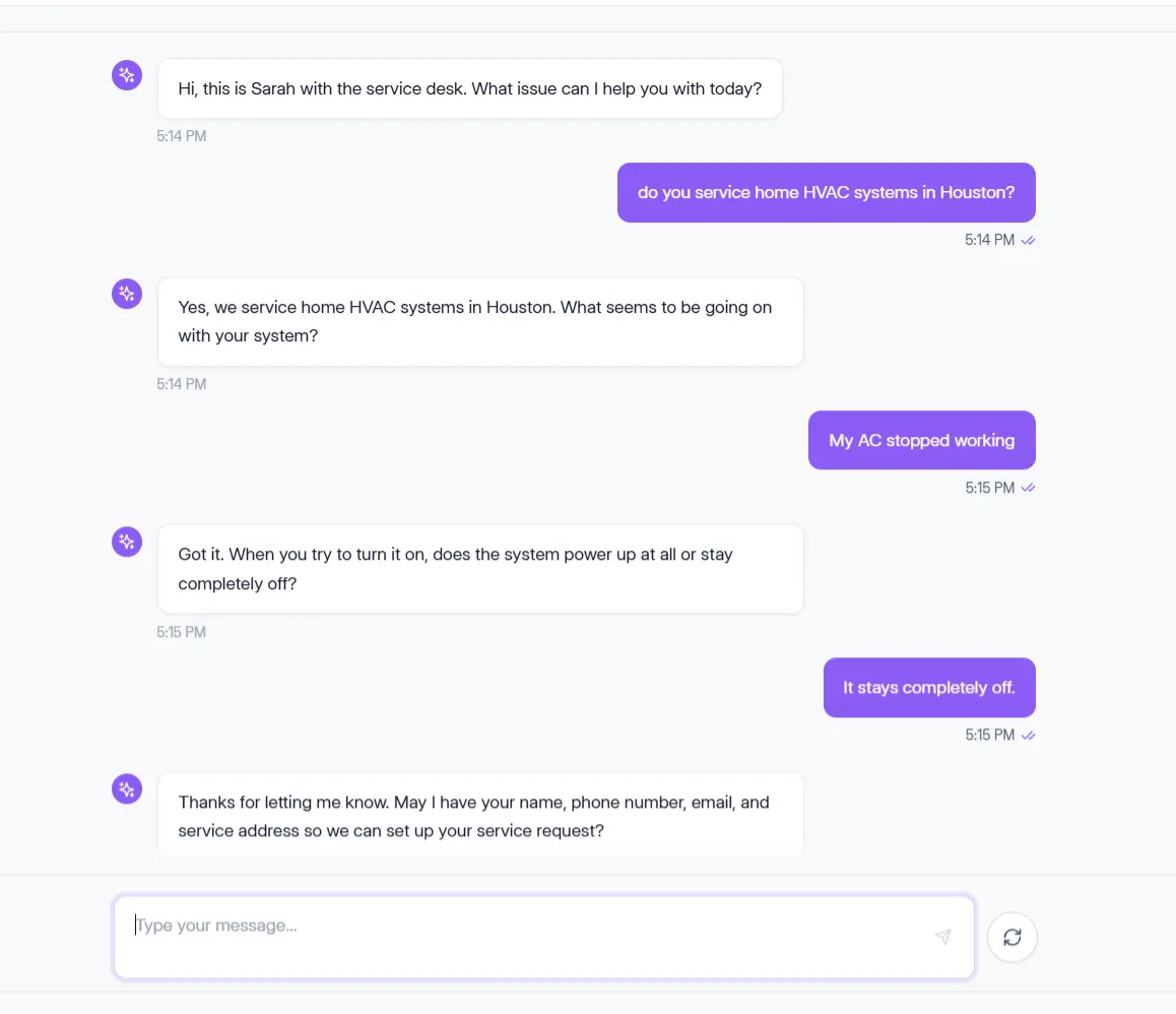 Prefer text? The same AI that handles your phone calls is available over chat — qualifying leads, answering service questions, and booking appointments in real time.